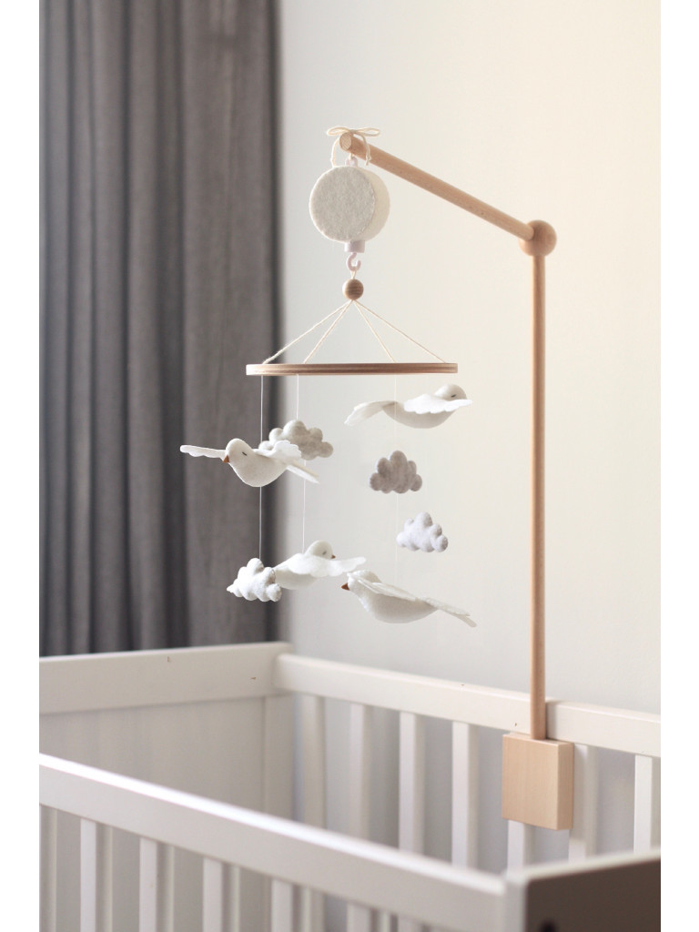 Součástí balení je strojek a univerzální, ručně vyrobený držák z bukového dřeva, který jednoduše přichytíte k dětské postýlce (návod na připevnění držáku naleznete zde). Lze ho navíc upevnit v různých výškách podle aktuální potřeby Vašeho miminka. Vybírat můžete hned ze tří variant - držák klasický (na fotkách), elegantní nebo elegantní v bílé barvě. S výběrem držáku vám pomůžeme zde.