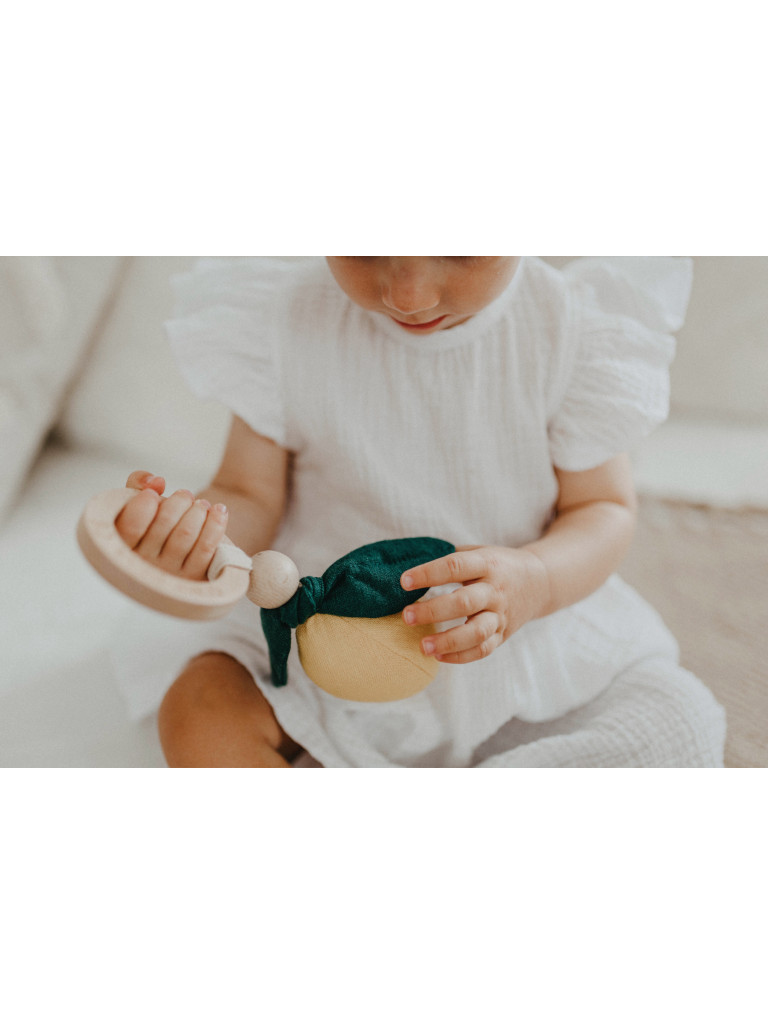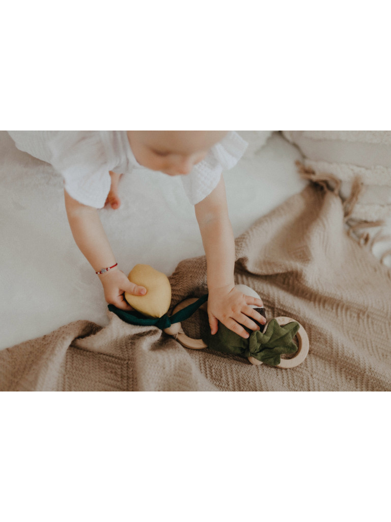 Hledáte originální a funkční hračku pro své miminko, nebo dárek pro miminko vašich blízkých? Naše kousátko vás okouzlí nejen svým minimalistickým designem, originálními materiály, ale především svou funčností. Má šustící lístky a unitř hrkací rolničku - což je pro miminko zaručená zábava! Dřevěný kroužek zase uleví od bolesti dásní při prořezávání zoubků.